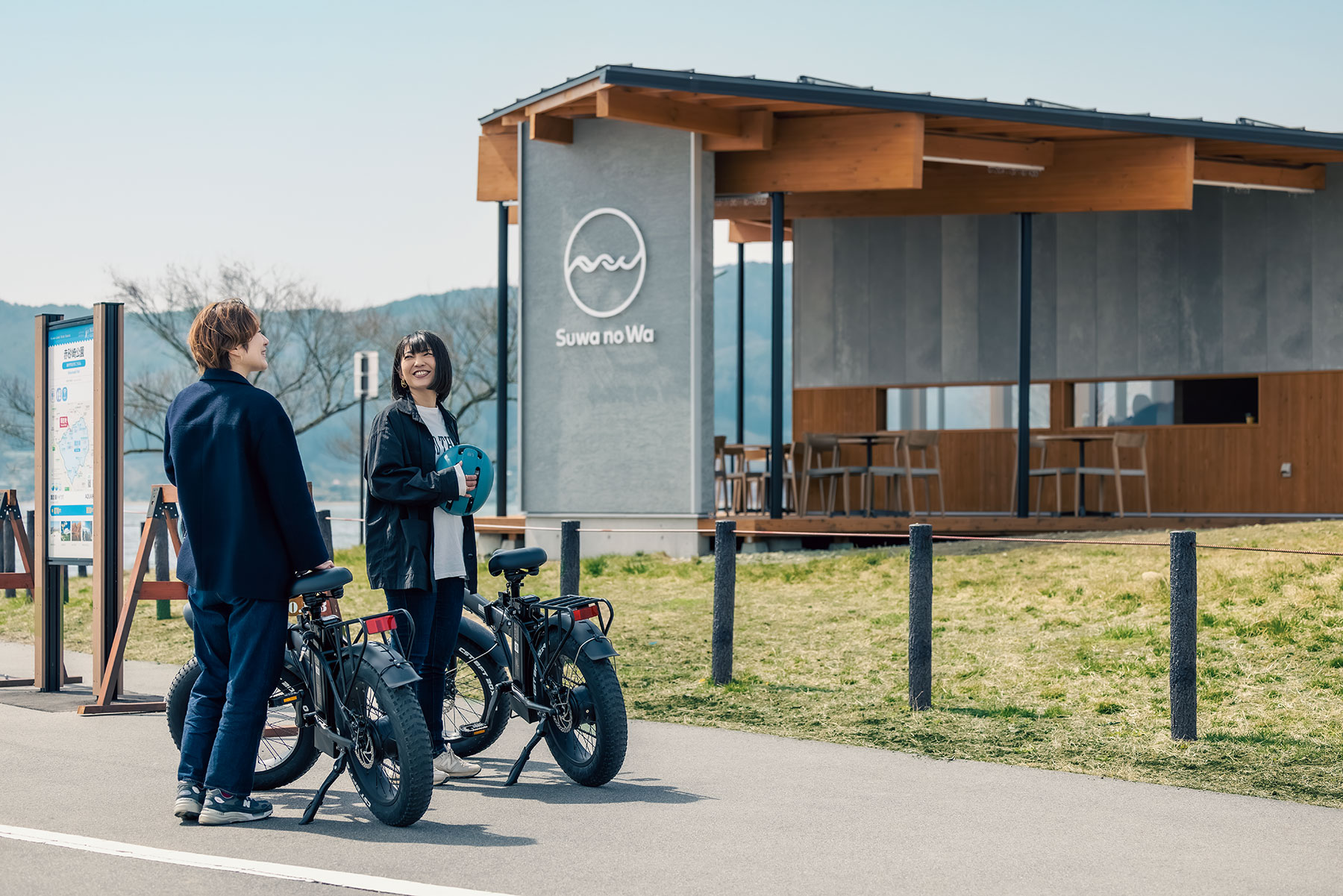 諏訪湖と八ヶ岳、富士山を望む絶景ロケーション。赤砂崎公園の豊かな自然に囲まれ、刻々と変わる湖畔の景色と風を五感で楽しむ、開放的なリラックス空間です。